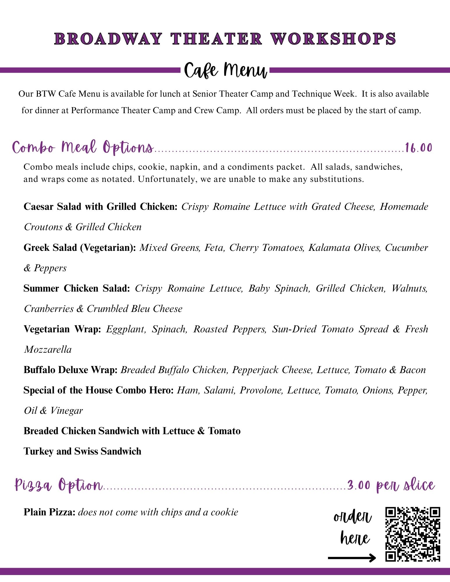 During our summer camp season, BTW hosts a Cafe and a Concessions Bar. Because our camp days are so busy, it is often easiest and preferred by students to purchase meals and snacks throughout the day using an online student Cafe Account. We ask that parents add money to their student’s Cafe Account for these purchases, especially because meal orders have to be placed in advance of each camp day. You will find our Cafe Menu below, as well as the Cafe Order Form. You will also see the purple button titled BTW Cafe & Concessions Payment. You will need to fill out the Cafe Order Form if you are purchasing meals AND pay via the Cafe Payment page. If your child plans to pack their meals and you only wish to add money for concessions payments, you can do that via the Cafe Payment page and do not need to fill out the Cafe Order Form.